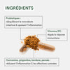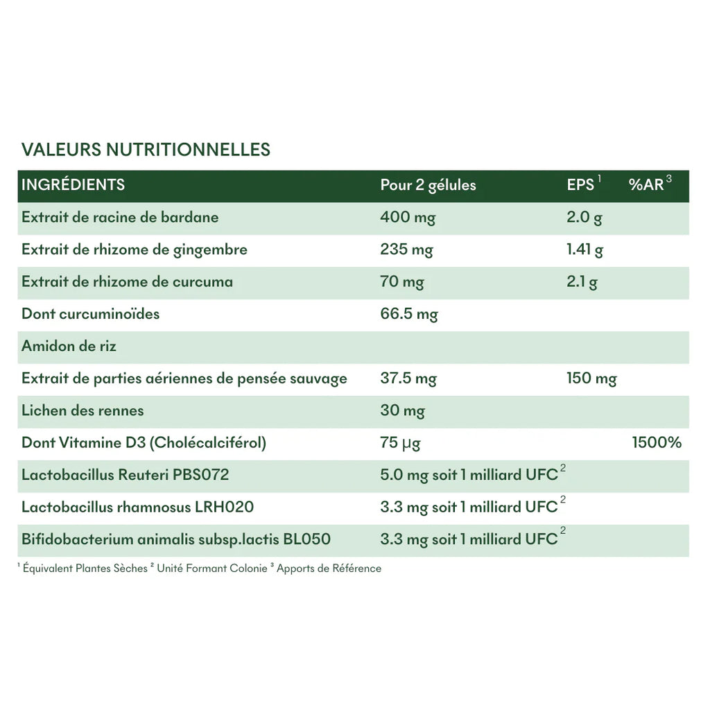 Extrait de racine de bardane (Arctium lappa), Extrait de rhizome de gingembre (Zingiber officinale), Gélule végétale (hydroxypropylméthylcellulose), Extrait de rhizome de curcuma (Curcuma longa), Curcuminoïdes, Amidon de riz (Oryza sativa), Extrait de parties aériennes de pensée sauvage (Viola tricolor), Lichen des rennes (Cladonia rangiferina), Vitamine D3 (Cholecalciferol), Probiotiques : Lactobacillus reuteri PBS072, Lactobacillus rhamnosus LRH020, Bifidobacterium animalis subsp. lactis BLO50.